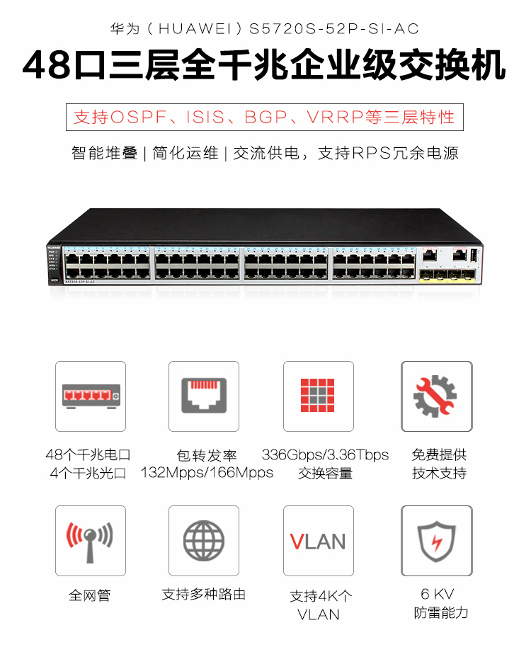 • 商品名称: 华为(HUAWEI)-交换机-S5720S-52P-SI-AC 48口新一代三层全千兆企业级核心网络交换机