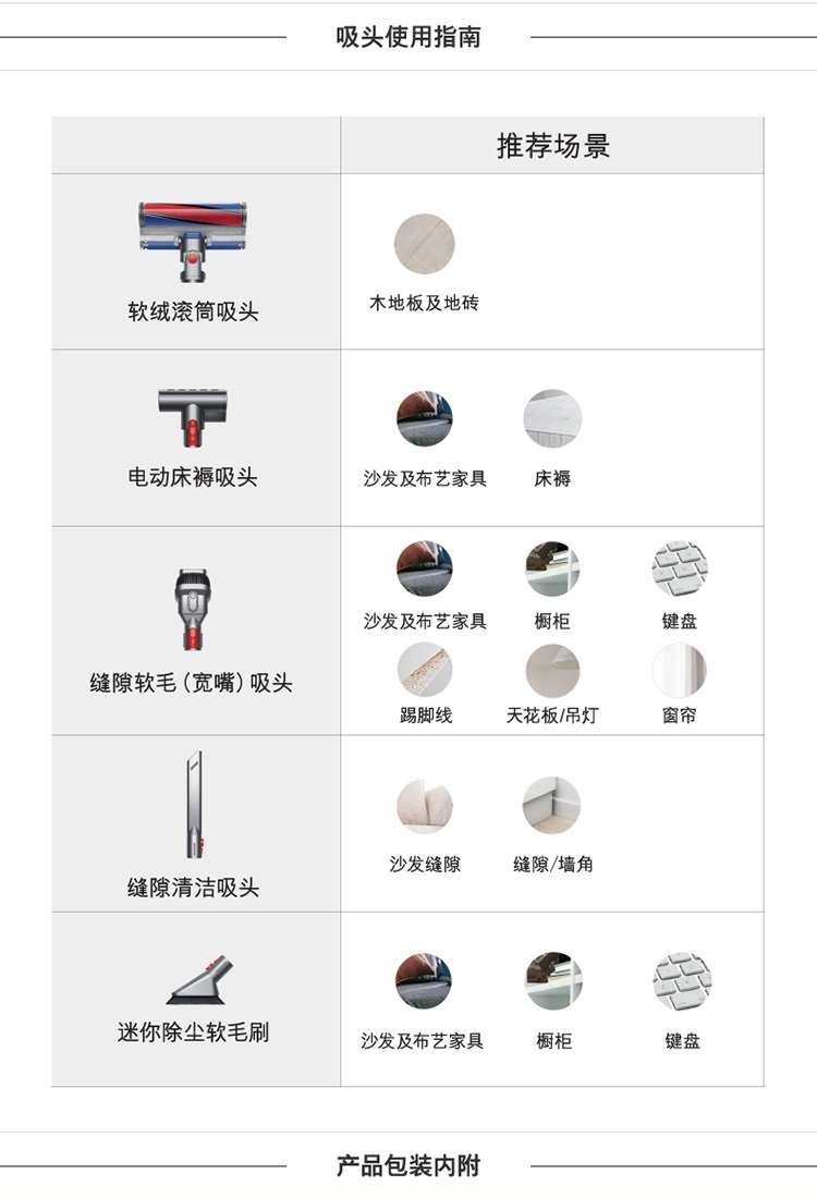 软绒滚筒吸头×1、缝隙软毛(宽嘴)两用吸头×1、缝隙清洁吸头×1、电动床褥吸头×1、除尘软毛刷×1 |